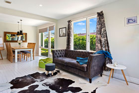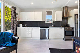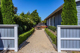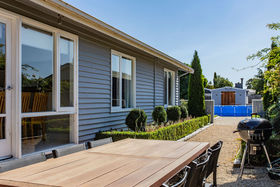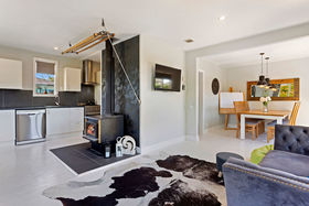 The home offers a large open-plan kitchen, dining, family room, with a glass door leading out to a north-facing, private and sheltered courtyard complete with a spa. Up the hallway are three bedrooms, family bathroom and laundry room with storage. The home is kept warm and dry with a log burner with wet back and a heat transfer system.